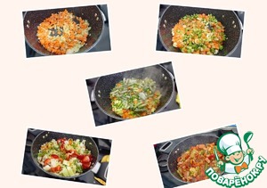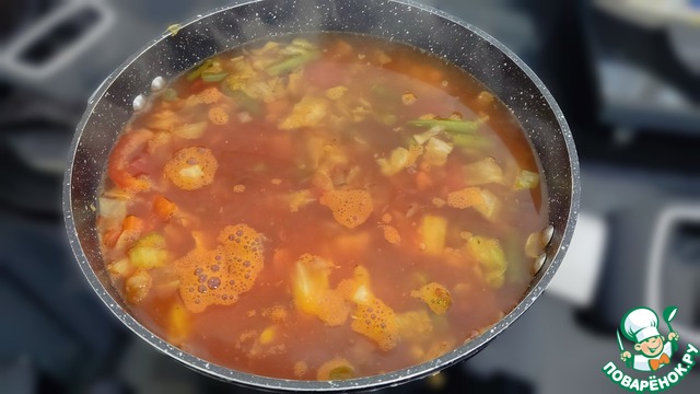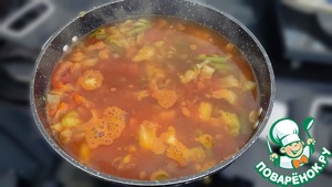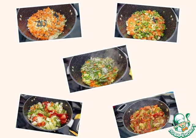 Добавить морковь, капусту, фасоль, сельдерей, помидоры резаные, сладкий перец.