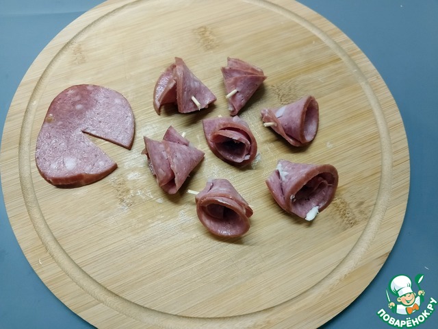Для 2 бутерброда ломтик копченой колбасы надрезать до середины. Свернуть.