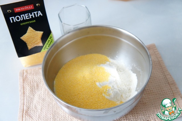 Смешать муку, разрыхлитель, ванилин, сахар, соль и поленту.