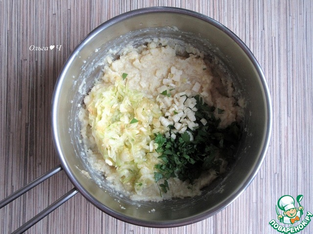 Добавьте отжатый от лишней жидкости кабачок (у меня 75 г), рубленную петрушку и мелко нарезанный чеснок. Перемешайте.