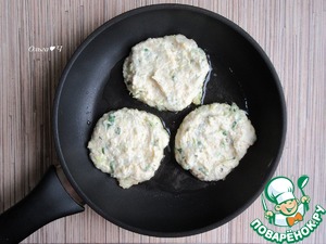 С помощью двух столовых ложек выкладывайте массу на разогретую сковороду с растительным маслом, формируя оладьи.