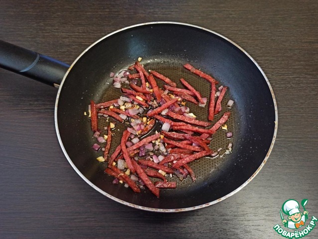 Добавить нарезанную соломкой острую колбаску чоризо и обжарить всё вместе 1 минутку.