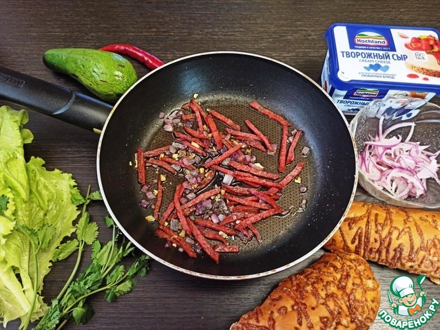 Сегодня у меня для вас острый и сытный сэндвич с мексиканским колоритом, (по-мексикански "тorta" значит сэндвич). В начинке собрались острая колбаса чоризо, авокадо, чили, маринованный лук, кинза и всё это объединяет творожный мягкий сыр от Hochland.
