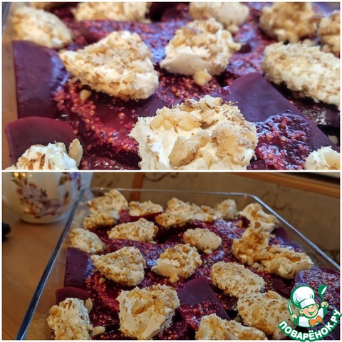 Вот честно, сама не ожидала, что из таких простых продуктов получится блюдо и в пир, и в мир. И стол банкетный украсит, и с подружками на посиделки самое то! Да плюс еще минимум калорий и полезность свеклы и зелени. Свекла, сваренная в вишневом соке, листики рукколы (последние с дачной грядки), и творожный сыр в ореховой обсыпке - невероятно вкусное сочетание! И готовится на раз-два!