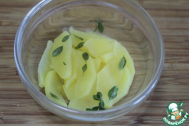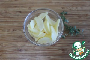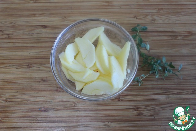 Яблоко очистить, порезать и добавить немного листиков свежего тимьяна, можно заменить на сушеный.