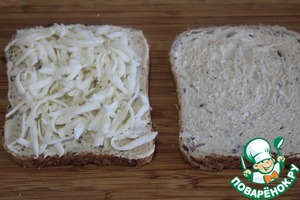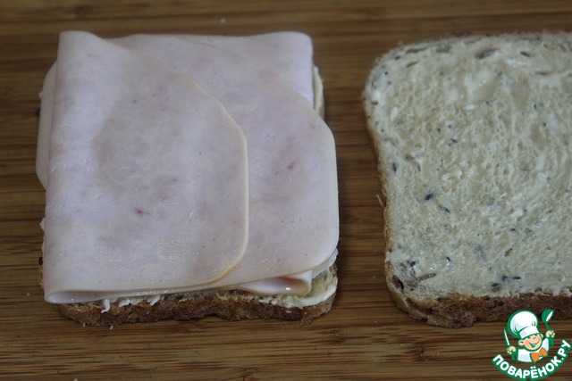 На сыр выложить 2 пластины ветчины, свернув по размеру тоста.