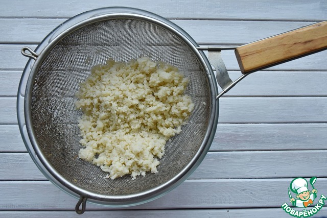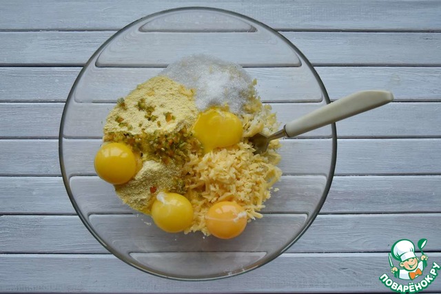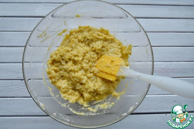 К готовому рису из цветной капусты добавляю четыре яичных желтка, сахар, поленту кукурузную, натертый на крупной терке твердый сыр, разрыхлитель, растопленное сливочном масло, измельченный острый перец. Перемешиваю смесь.