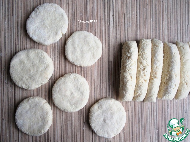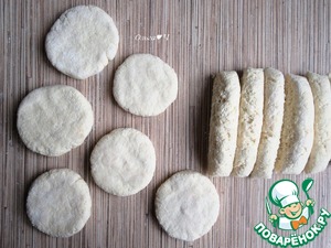 Скатайте из теста колбаску и нарежьте на 12 частей, припыляя мукой руки, из каждой части сформируйте лепешку, диаметром около 6 см.