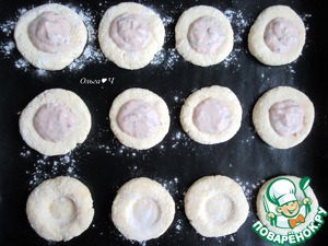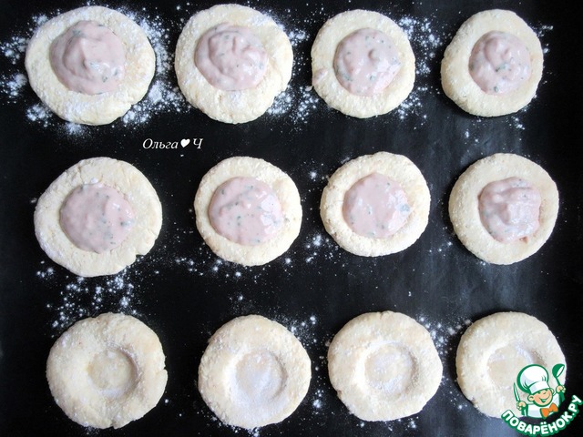 Творожные лепешки переложите на противень, застеленный ковриком для выпечки. Слегка присыпьте заготовки мукой и в центре каждой сделайте углубление с помощью донышка рюмки. Заполните углубления начинкой.