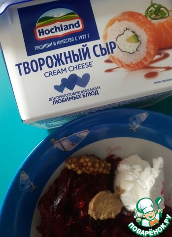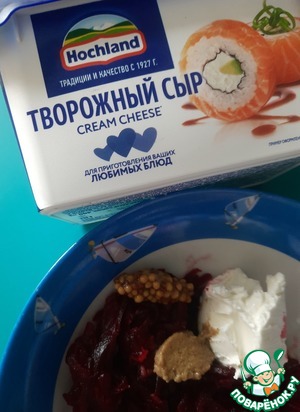 Смешать творожный сыр ТМ Hochland, свёклу, измельчённых чеснок, соль, горчицу
