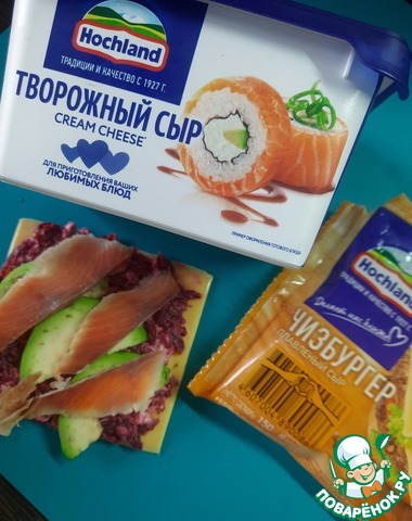 На ломтик плавленного сыра "Чизбургер " от ТМ Hochland выложить свекольную намазку, несколько ломтиков авокадо и лосося.