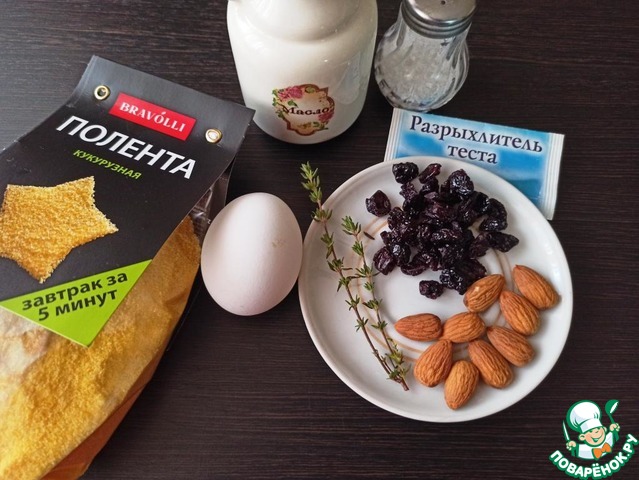 Подготовить ингредиенты для выпечки кукурузного хлеба. Я взяла поленту ТМ Bravolli. Кожицу с миндаля снимать не стала. Вишня домашняя, сама вялила летом.