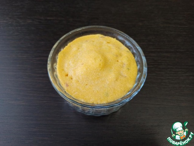 Смешать в миске кукурузную поленту соль, сахар, разрыхлитель и яйцо. Добавить немного воды, 1-2 ст. л. и оставить на 10-15 минут, чтобы полента набухла.