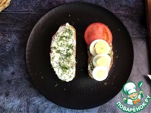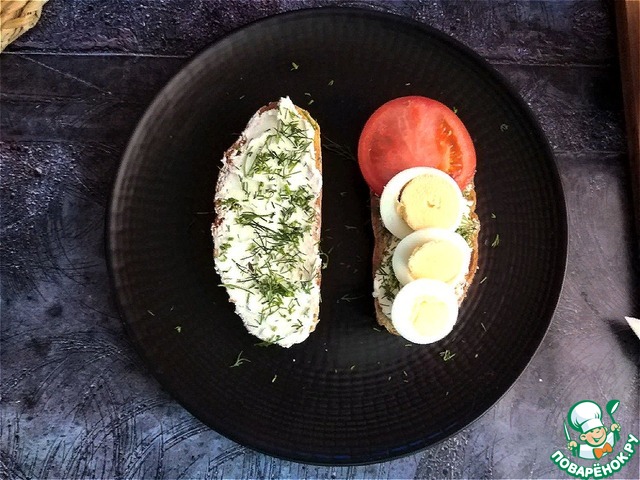 Сыр на бутерброде присыпаем укропом (зеленью). Выкладываем на один край дольки помидора и далее - дольки яйца.