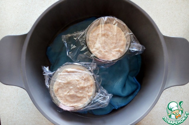 Для приготовления понадобятся высокие чашки (у меня 4 шт.). Смажьте их растительным маслом и наполните на 3/4 объёма массой (во время приготовления масса увеличивается в объёме). Слегка постучите чашкой по столу, чтобы не было пустот, при необходимости утрамбуйте массу с помощью ложки. Накройте чашки пищевой плёнкой. На дно кастрюли постелите полотенце и поставьте чашки. Налейте воду до верха чашек и поставьте на огонь. После закипания убавьте огонь до минимума, накройте кастрюлю крышкой и готовьте 45 мин.