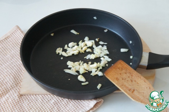 Обжарьте маленькую луковицу и чеснок на смеси растительного и сливочного масла.