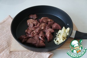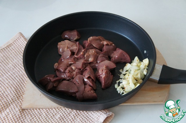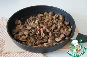 После того, как овощи зазолотились -добавьте печень и обжаривайте минут 8-10 до готовности. Посолите. Добавьте полрюмки коньяка, дайте выпариться.