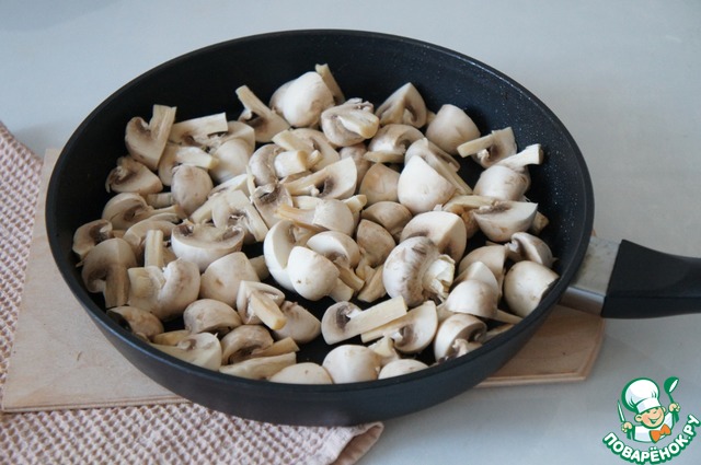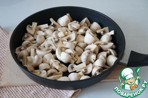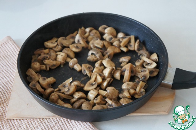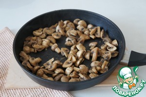 На эту же сковороду отправьте порезанные шампиньоны, посолите и обжаривайте, помешивая.