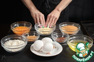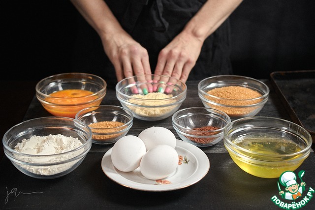 Начнем готовить с бисквита. Из полученных ингредиентов выйдет два бенто.
