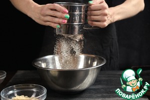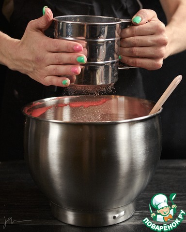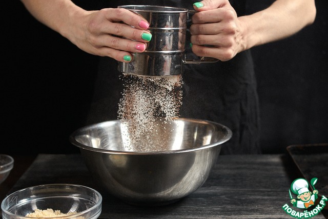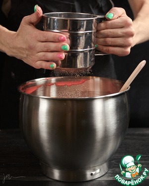 Просеять в несколько этапов сухие ингредиенты, аккуратно перемешать лопаткой.