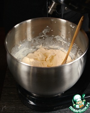 Белки взбить до крепких пиков с 35 граммами сахара и щепоткой соли.