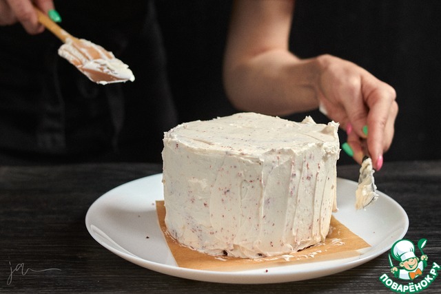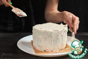 Равномерно распределить слой крема по одному бисквиту. Перед этим срезать сухой край.