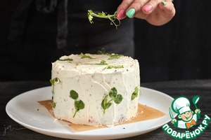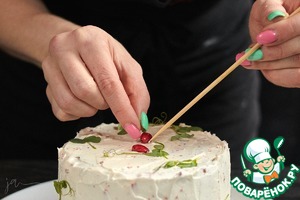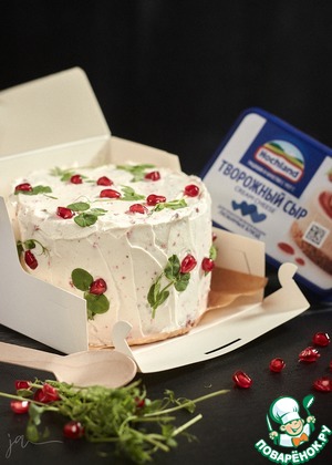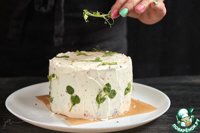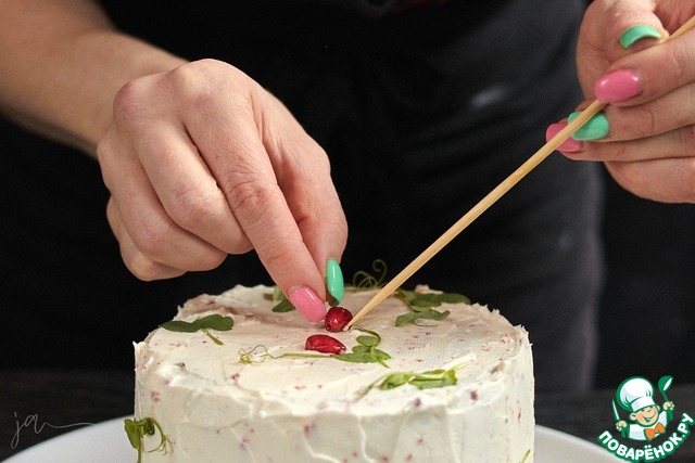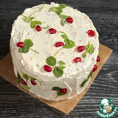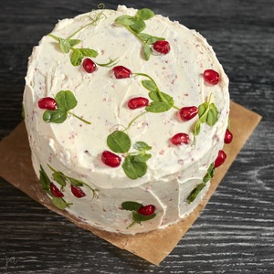 Я решила придать торту цветущий вид, украсив его микрозеленью гороха и зернами граната.