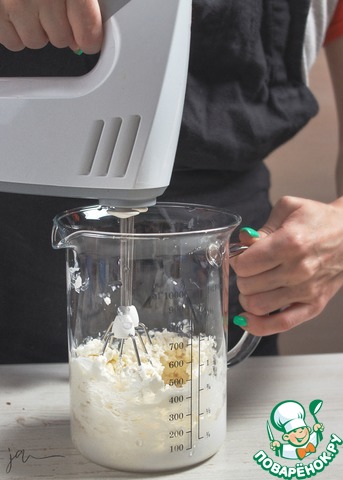 В белки добавить половину эритрита и взбить до крепких пиков.