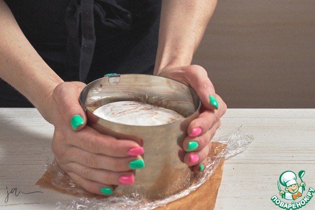 Обтянуть пленкой и зажать в кольцо. Дать настояться в холодильнике около двух часов.