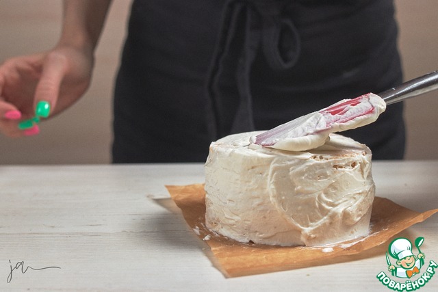Покрыть торт кремом. При желании можно посыпать кокосовой стружкой.