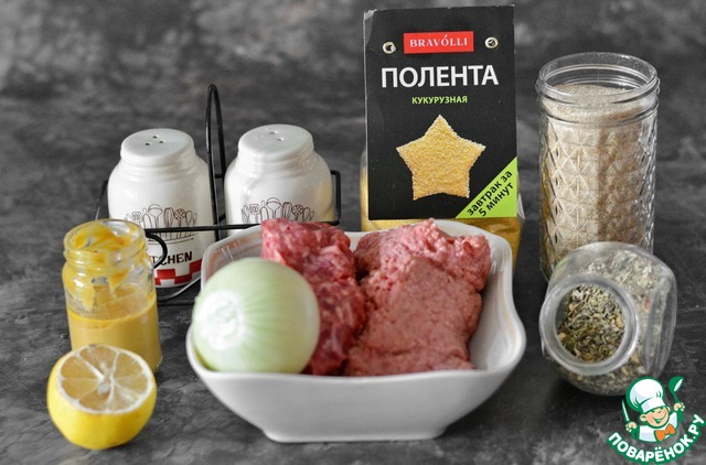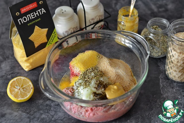 К мясному фаршу добавьте измельченный на тёрке репчатый лук, панировочные сухари, кукурузную поленту.