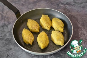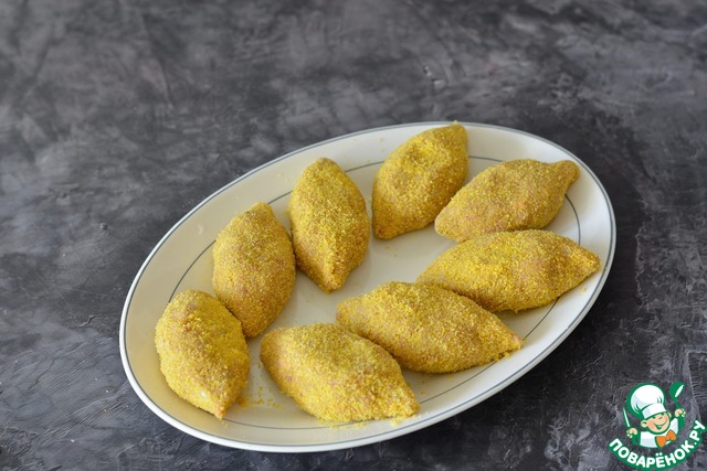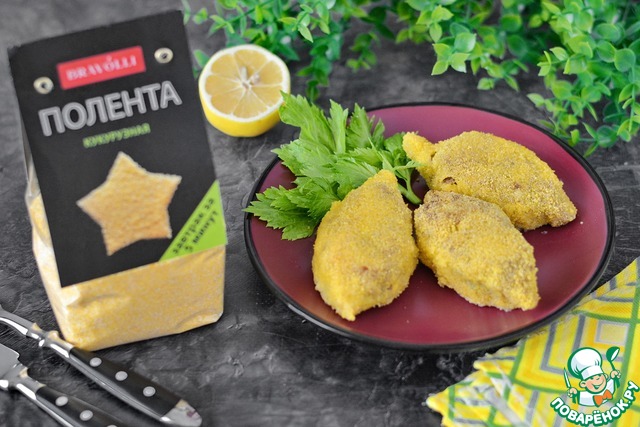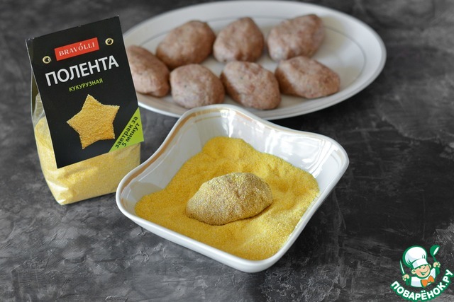 Сформируйте из котлеты овальной формы и хорошенько запанируйте их в кукурузной поленте.