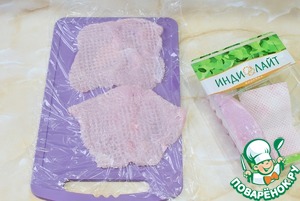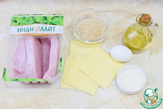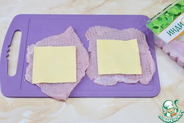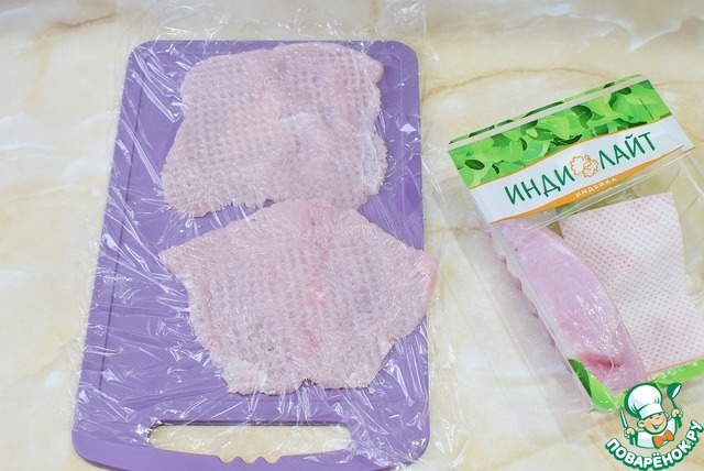 Для приготовления рулетиков возьмите необходимые ингредиенты. Отличным вариантом будет взять стейки грудки Индилайт. Они уже нарезаны, Поэтому их удобно отбивать. Можно взять сразу целый стейк для крупного рулета. А можно разрезать и сделать маленькие рулетики, как у меня. Чтобы не тратить лишнее время на подготовку начинки, воспользуйтесь готовыми ломтиками плавленого сыра.