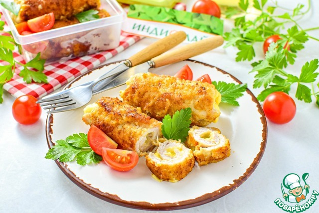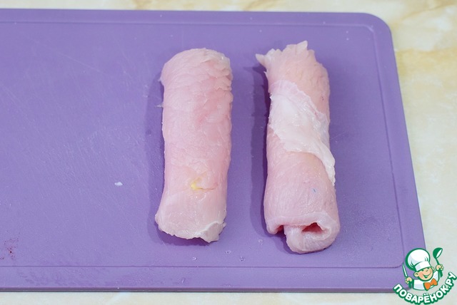 На каждый кусочек выложите по ломтику плавленого сыра и сверните в рулетик.