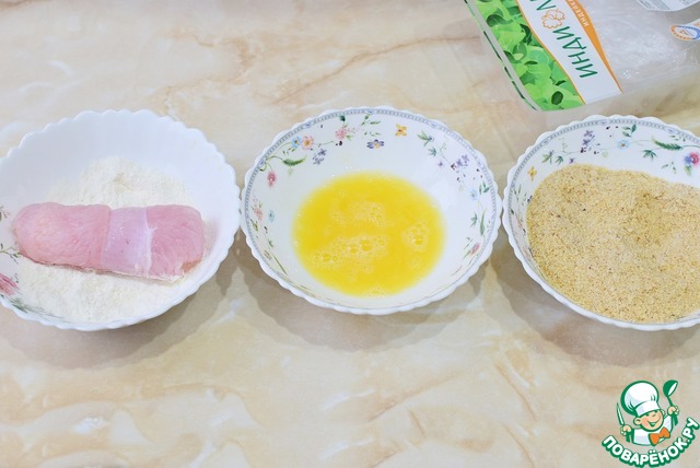 Мясные рулетики обваляйте в муке, затем окуните в яйцо и в панировочные сухари.