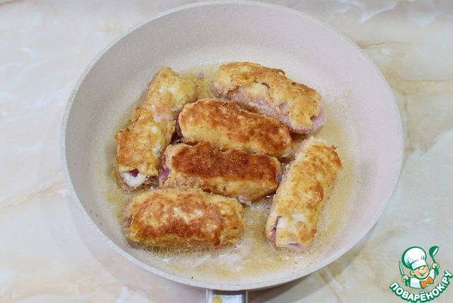 Разогрейте сковороду до горячего состояния, налейте немного растительного масла и выложите рулетики швом вниз. Готовьте их на малом огне, чтобы они успели прожариться внутри, но не начали подгорать снаружи.