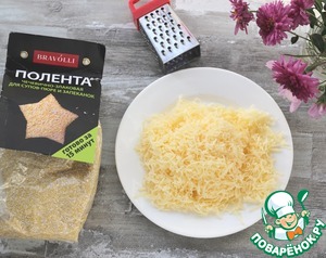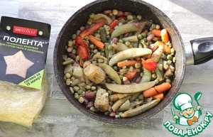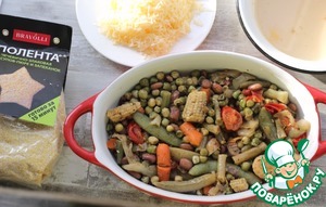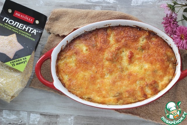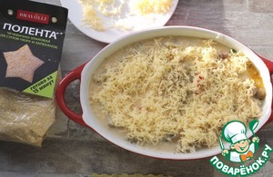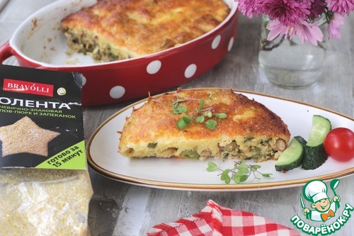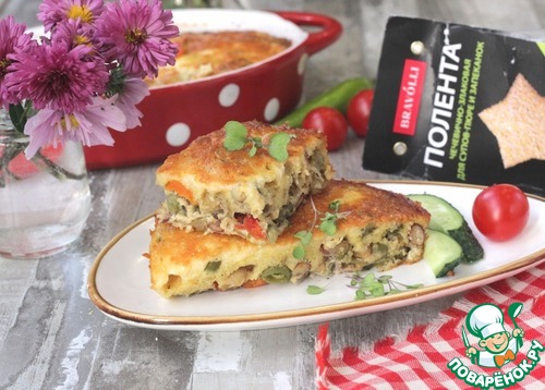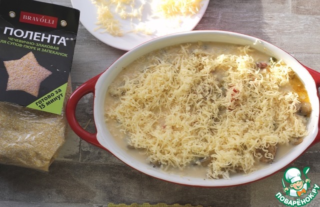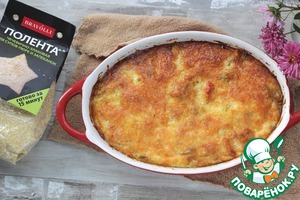 Вылить в овощную смесь яично-сливочную заливку с полентой, посыпать натертым сыром и поставить в хорошо разогретую духову 180* на 20-25 минут, учитывая особенности своей духовки
