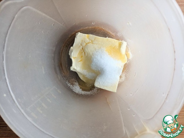 В чаше соединяем мягкое сливочное масло и сахар (у меня - заменитель), взбиваем миксером до растворения сахара.