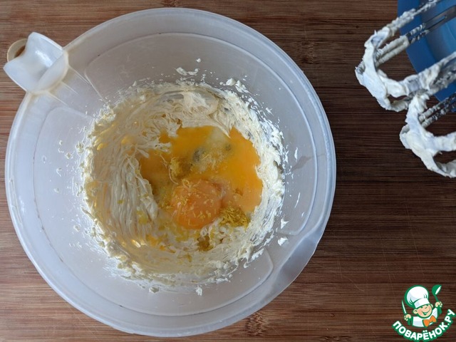 Добавляем соль, цедру лимона, желток. Ещё раз взбиваем.