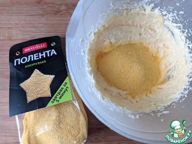 Насыпаем кукурузную поленту. У меня - ТМ Bravolli. Перемешиваем.