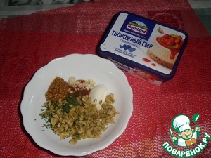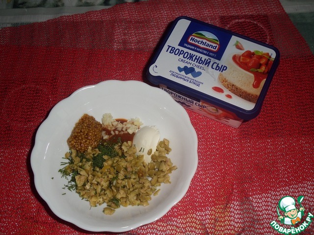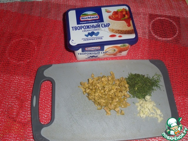 В миску выкладываем творожный сыр, томатный соус, горчицу, нарезанный чеснок, оливки и зелень.