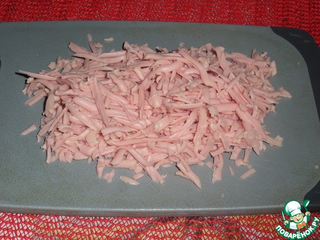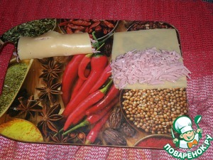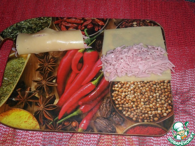 На ломтики сыра выкладываем измельченную вареную колбасу и скручиваем в виде трубочки.
