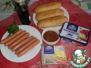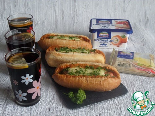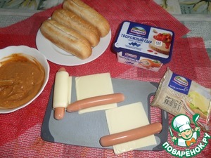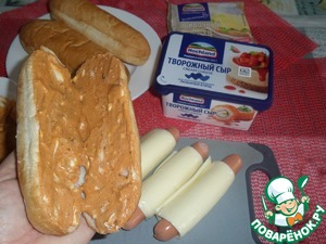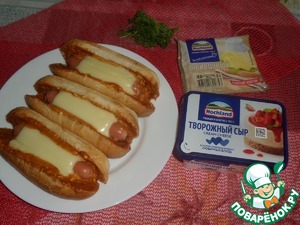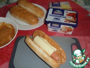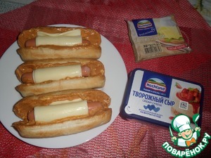 Внутрь каждой булочки кладем сосиски в сырных ломтиках.