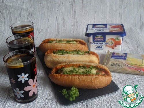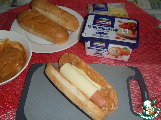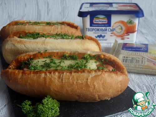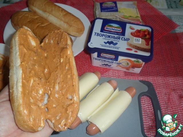 Каждую булочку надрезаем вдоль и смазываем изнутри приготовленным соусом.