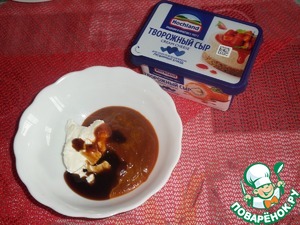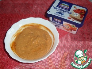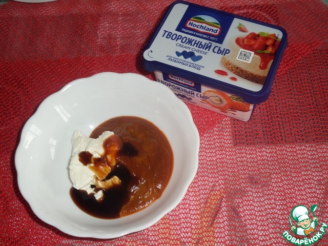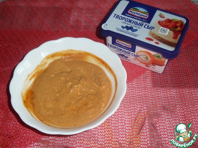 В миску выкладываем творожный сыр, томатный соус и соевый соус "терияки".