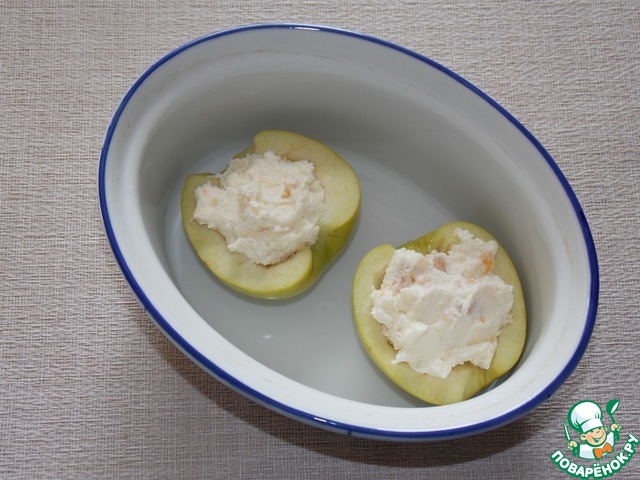 Наполнить половинки яблок начинкой.