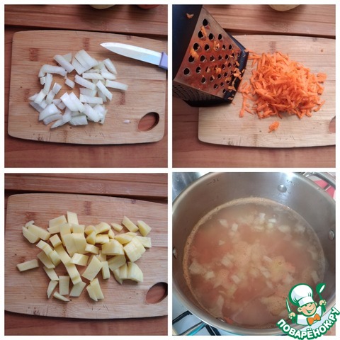 Лук и картофель нарезайте по своему вкусу. Морковь натираем на тёрке средней величины. Бульон закипел. Отправляем эти овощи и варим минут 10 на минимальном огне под крышкой.
