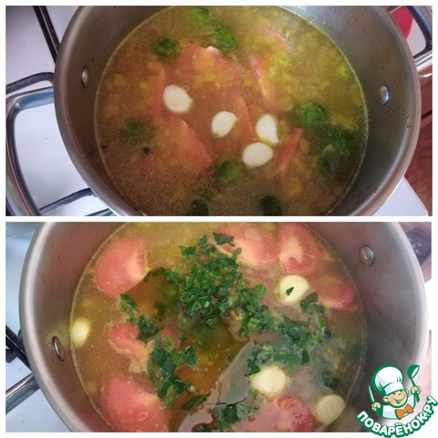 С брюссельской капусты сливаем воду и отрезаем у кочанчиков выступающие кочерыжки. Так как кочанчики у меня не очень крупные, я их оставлю целыми. Крупные можно порезать пополам. Перец болгарский чистим от семян и нарезаем тоже так, как вам нравится. Я порезала его мелким кубиком. В кастрюлю, где варятся овощи, выкладываем куркуму и горошки перца, солим по вкусу. Отправляем в кастрюлю болгарский перец, брюссельскую капусту. Постоянно помешивая по кругу в центре, всыпаем чечевично-злаковую поленту тонко. Примерно так же, как вы сыплете манку, когда варите манную кашу. Перемешиваем и варим 15 минут до готовности поленты и супа. Готовим помидор, который я нарежу крупными осьмушками. Рубим мелко петрушку. Чеснок у нас целыми зубчиками.