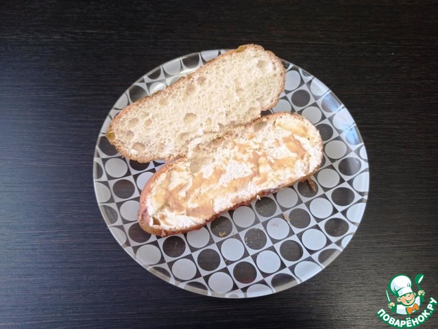 Булочку разрезать и смазать сливочным маслом (можно майонезом) и немного горчицей.
