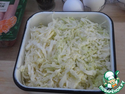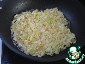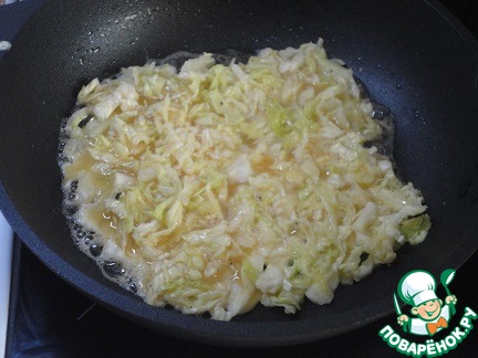 Выложите одну часть капусты на сковороду с маслом, разровняйте, придавая примерно форму прямоугольника.